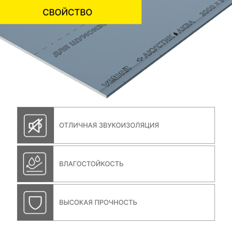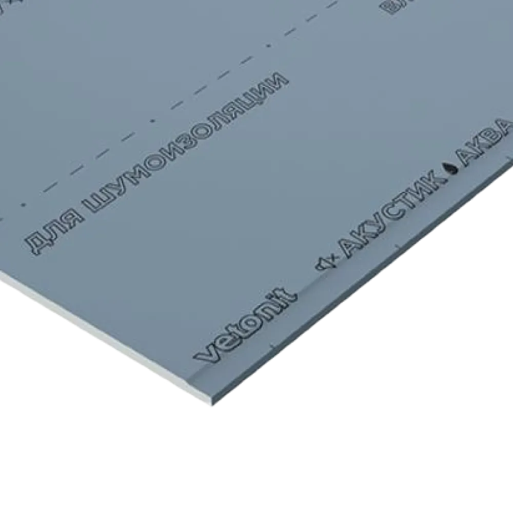 Компактная звукоизоляционная влагостойкая гипсовая строительная плита Vetonit Acoustic Aqua (ГСП-DH3) – плитный отделочный материал для устройства перегородок, потолков и облицовки стен в помещениях с повышенными требованиями к шумоизоляции. Плита состоит из гипсового сердечника повышенной плотности, облицованного картоном синего цвета.