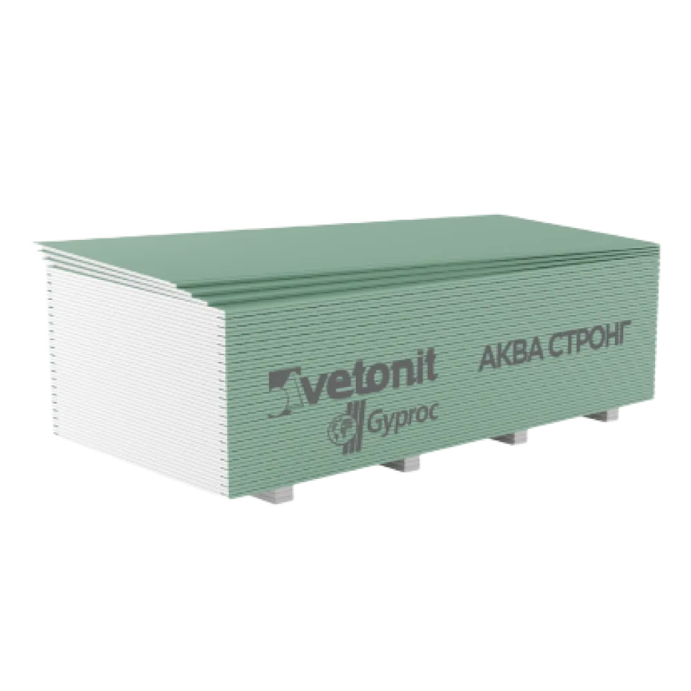 Гипсовая влагостойкая плита Vetonit (Gyproc) Аква Стронг (ГСП-RH3) толщиной 15мм обладает высокой плотностью. Это обеспечивает жесткость конструкции, сопоставимую с двумя стандартными плитами толщиной 12мм. Предназначена для монтажа в один слой межкомнатных перегородок, потолков и облицовок в ванных, санузлах и кухнях. Применяется в шумоизоляционной конструкции для обшивки каркаса на металлических профилях с заполнением минеральной ватой. ГСП состоит из усиленного армирующими волокнами сердечника, облицованного картоном зеленого цвета. Выдерживает до 70кг на 2 дюбель-бабочки.