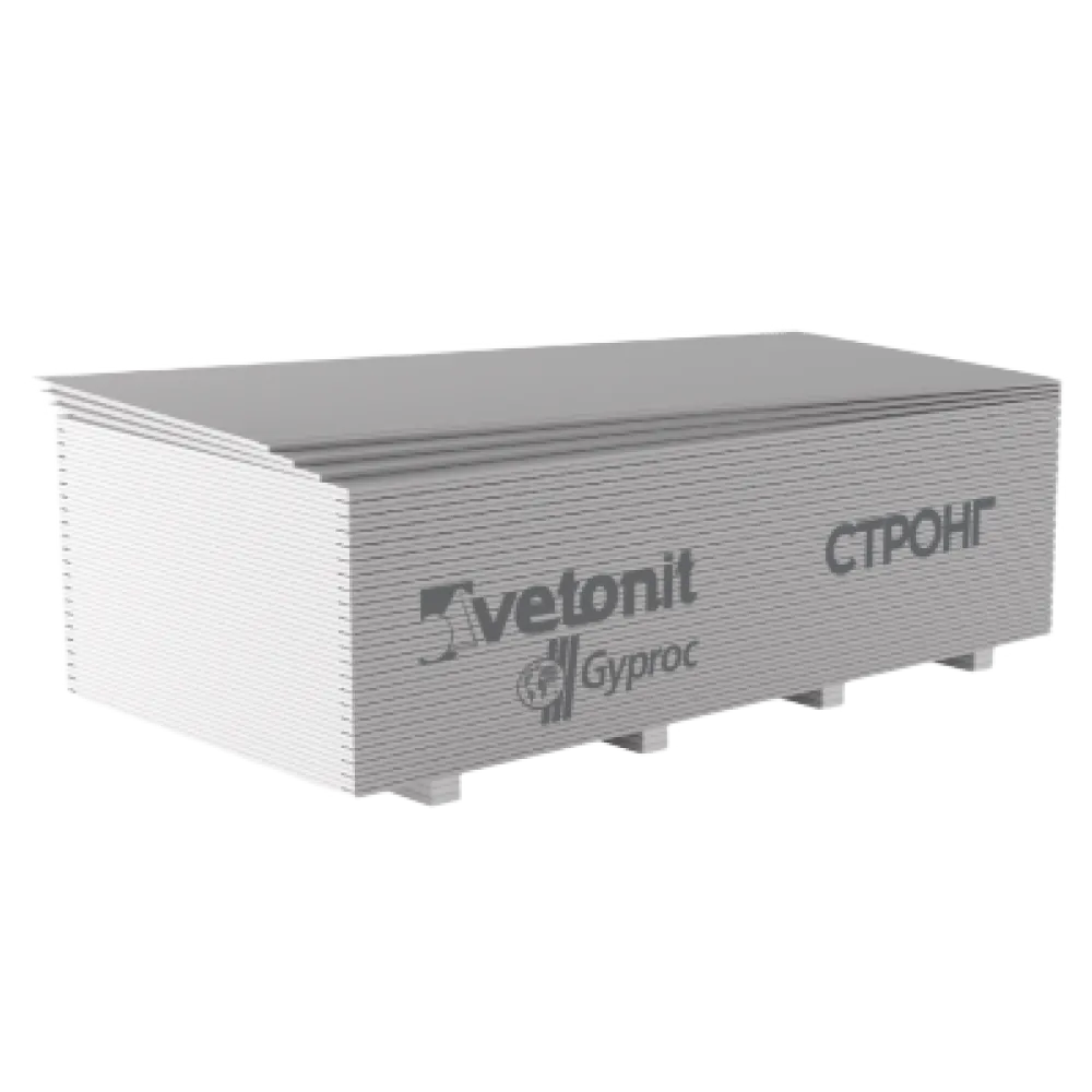 Гипсовая плита Vetonit (Gyproc) Стронг толщиной 15 мм (ГСП-R) – предназначена для монтажа межкомнатных перегородок, потолков и облицовок. Материал обладает большой прочностью и применяется в шумоизоляционной конструкции для обшивки каркаса на металлических профилях с заполнением минеральной ватой. ГСП состоит из усиленного армирующими волокнами сердечника, облицованного картоном светло-серого цвета. Специальные добавки в сердечнике позволяют повесить большой телевизор или полку даже на однослойную конструкцию в любое место и без применения закладных деталей.