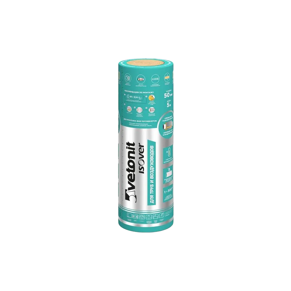 ISOVER Для труб и воздуховодов - это минеральная изоляция на основе кварца в рулоне для трубопроводов, воздуховодов и емкостей для воды. Благодаря специальной технологии производства материал выдерживает высокую температуру до 300 С и не сжимается при монтаже даже в криволинейных конструкциях.
