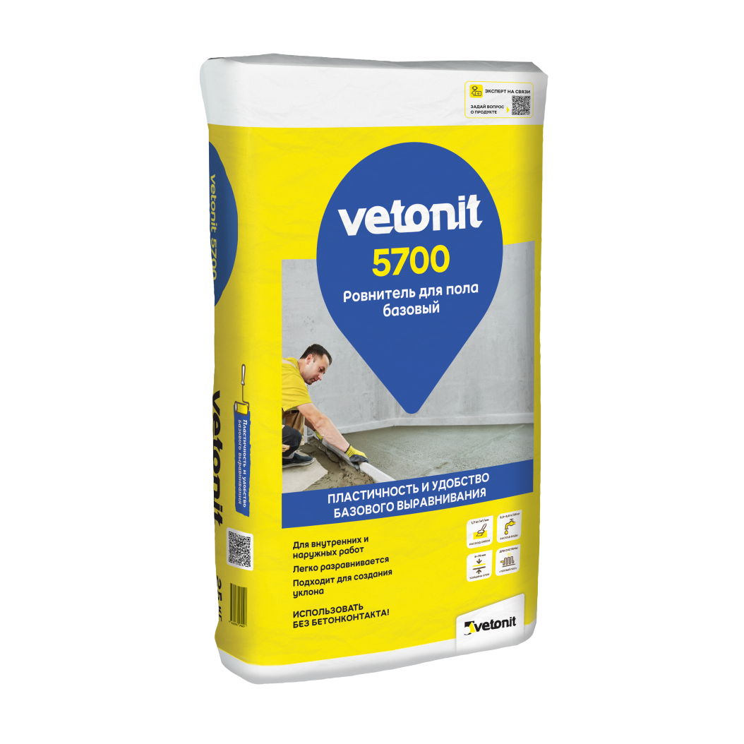 Ветонит (vetonit) 5700 - базовый ровнитель для пола. Подходит для выравнивания слоем 5-70 мм. Подходит как для внутренних, так и наружных работ. Особенно подойдет для промерзающих и неотапливаемых помещений: подвала, балкона, террасы, веранды. Для ручного нанесения. Обладает повышенной пластичностью для удобной работы.