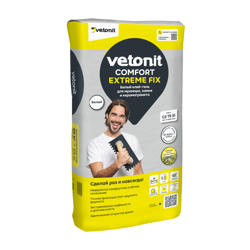 Ветонит (vetonit) Comfort Extreme Fix - белый клей-гель для мрамора, камня и керамогранита. Белоснежный цвет, сверхпрочная адгезия, увеличенное открытое время, эластичность и повышенная производительность, а также отсутствие сползаний позволяют выполнять облицовку плитами особо крупного формата без ограничений. Белый клей-гель предназначен для каменных, мраморных, гранитных и керамогранитных плит любого формата. Область применения не имеет ограничений: подходит даже для облицовки бассейнов и фонтанов с постоянным столбом воды, для общественных зон с повышенной проходимостью и высокой динамической нагрузкой. Применяется для особо сложных оснований: плитка на плитку, ДВП, ДСВ.