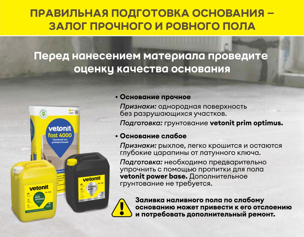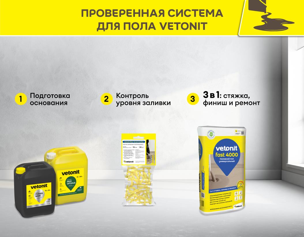 Ветонит (vetonit) Fast 4000 - самовыравнивающийся универсальный быстротвердеющий наливной пол. 3 в 1: стяжка, финиш + ремонт благодаря широкому диапазону толщин (3-80 мм). Применяется как в сухих, так и во влажных помещениях под укладку ламината, плитки, линолеума, ковролина и тп. Применим для системы «теплый пол» с электроподогревом. В зависимости от типа напольного покрытия и толщины слоя его укладка возможна от 1 дня. Ходить по полу разрешается уже через 4 часа. Продукт обладает оптимальным расходом, высокой растекамостью и удобен в работе.