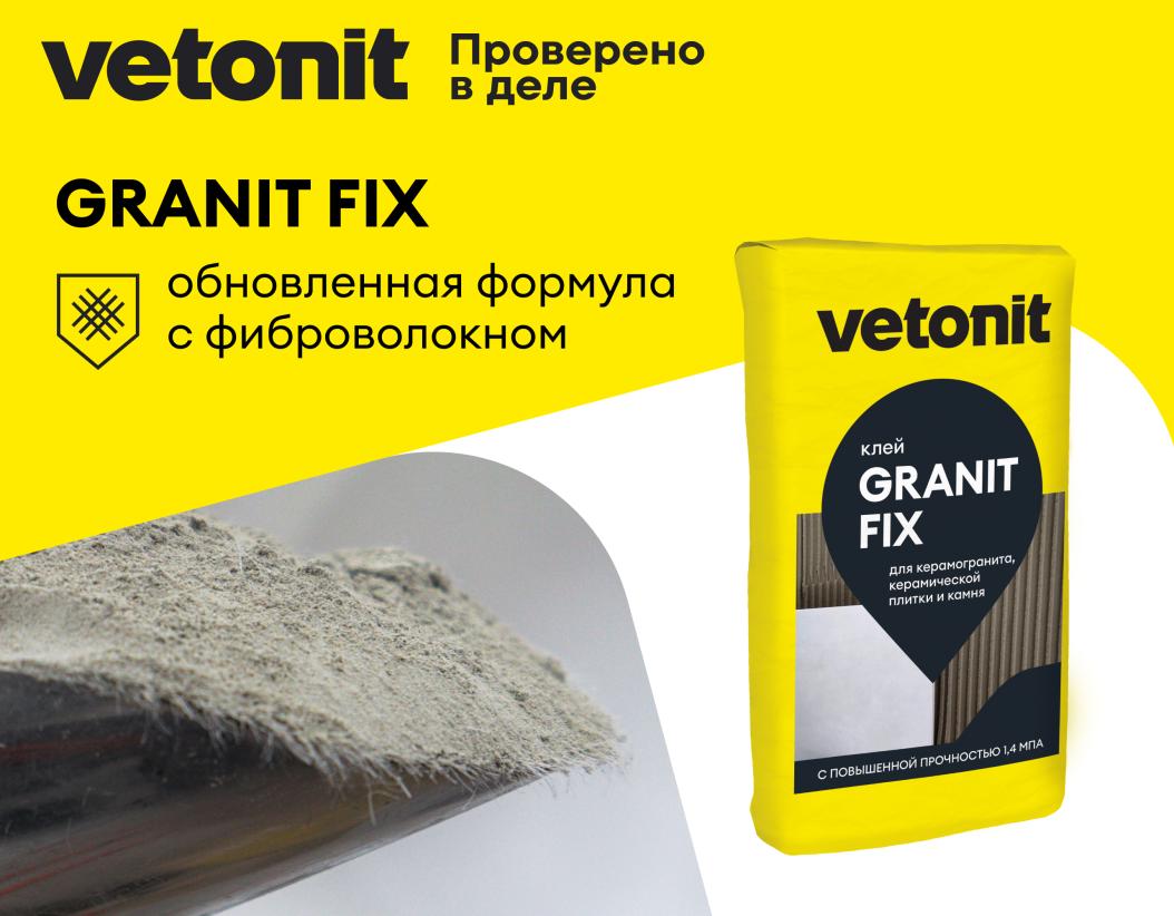 Ветонит (vetonit) granit fix - клей класса С2 Т подходит для внутренних и наружных работ, для стен и пола, включая систему «Теплый пол». Рекомендованный формат керамогранита – до 100х100 см.