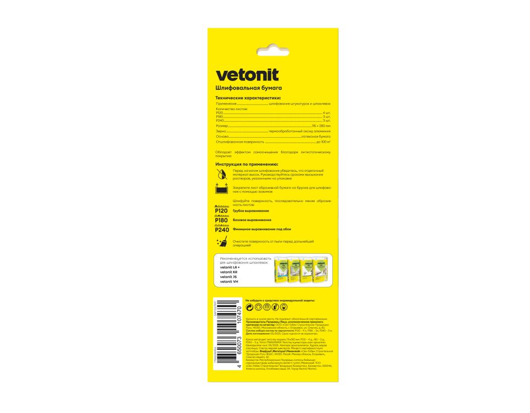Шлифовальная бумага Ветонит (vetonit) Norton предназначена для шлифовки штукатурок и шпаклевок таких как Ветонит (vetonit) LR+ , Ветонит (vetonit) VH , Ветонит (vetonit) JS, Ветонит (vetonit) KR на любой вяжущей основе для подготовки поверхности под оклейку обоями. Благодаря острым, термообработанным абразивным зернам, гибкой латексной бумаге и антистатическому покрытию шлифовальная бумага не рвется , работает гораздо быстрее, с максимальным ресурсом работы и высоким уровнем производительности в течение всего времени использования. Как результат идеальная поверхность для финишной отделки. Набор состоит из 10 листов размера 115х280 мм (4 листа Р120, 3 листа Р180, 3 листа Р240).