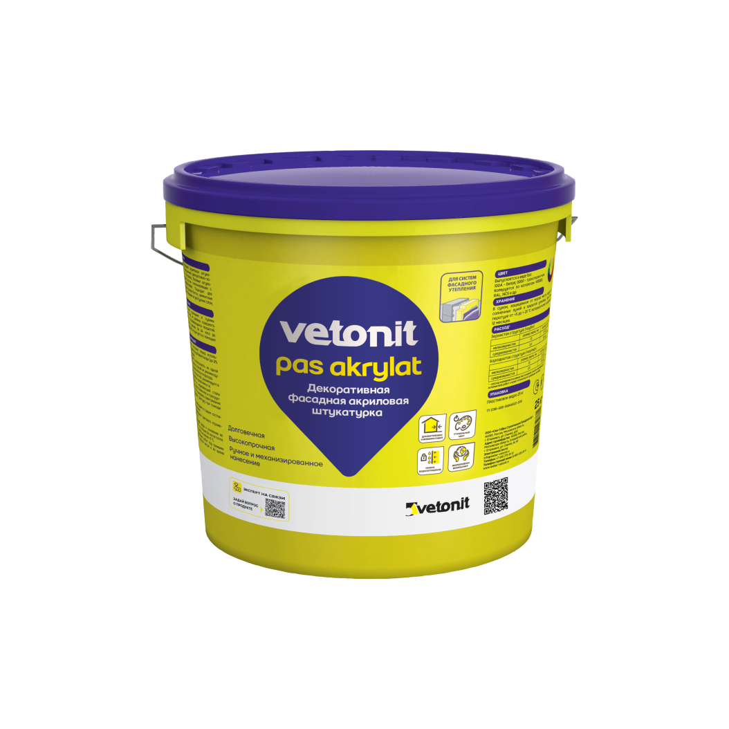 Ветонит (vetonit) pas akrylat - акриловая декоративная штукатурка. Подходит для создания декоративно-защитного финишного слоя на поверхности теплоизоляционных фасадных систем с пенополистиролом. Обладает отличными эксплуатационными свойствами. Легка в работе. Не требует последующей окраски. Представлена в фактурах "шуба" и "короед" с размером зерна 1,5 и 2 мм.