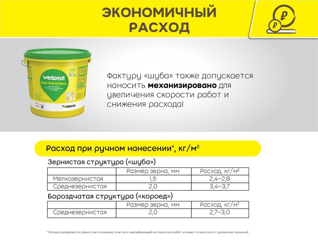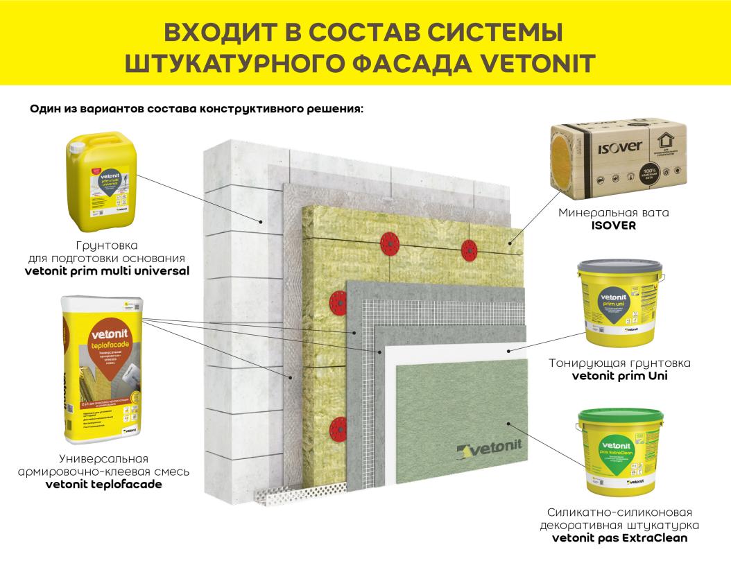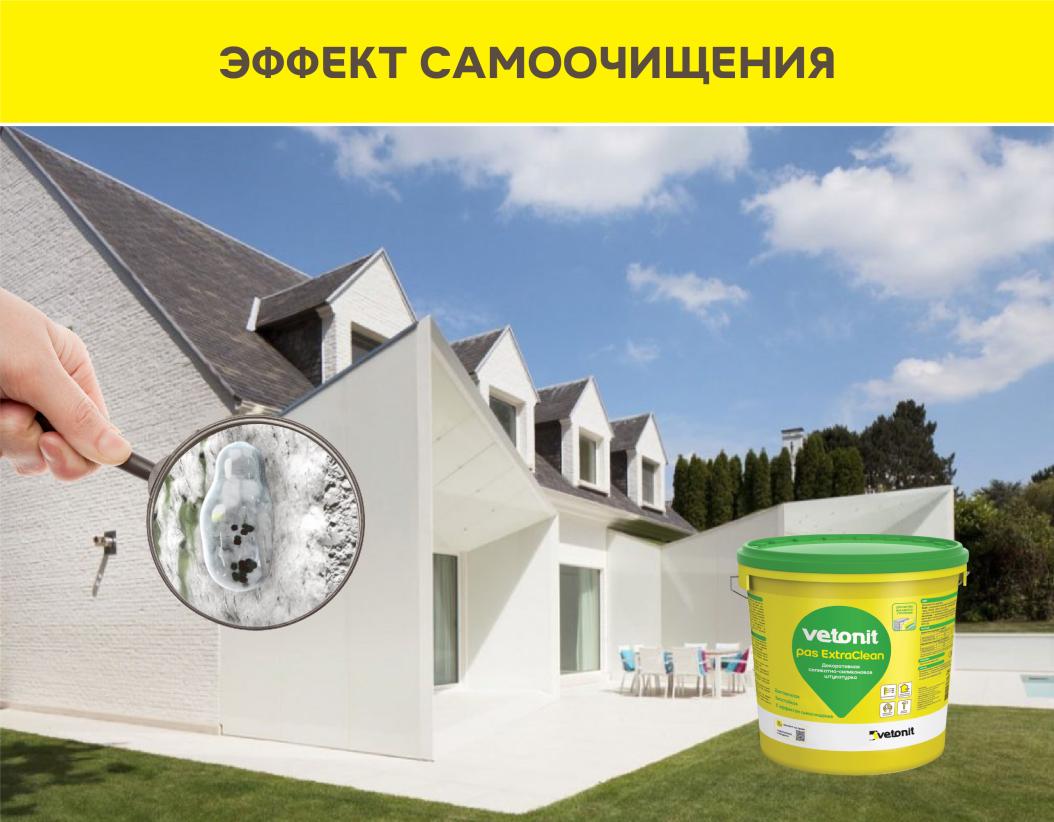Ветонит (vetonit) pas ExtraClean - высококачественная силикатно-силиконовая декоративная штукатурка. Подходит для создания декоративно-защитного финишного слоя на поверхности систем фасадного утепления c минеральной (каменной и кварцевой) теплоизоляцией или пенополистиролом. Представлена в фактурах "шуба" и "короед" с размером зерна от 1,5 до 2 мм. Обладает эффектом самоочищения, защищает стену от образования грибка и плесени - идеально подходит для декоративного слоя на фасаде.