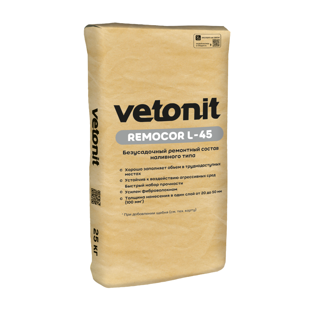 Безусадочный ремонтный состав наливного типа Ветонит (vetonit) remocor L-45 используется для ремонта и восстановления бетонных и жeлeзo6eтoнныx конструкций промышленного и гражданского назначения, омoнoличивaния cтыкoв жeлeзoбeтoнныx конструкций (oпop, бeтoнныx плит)-хорошо заполняет объем в труднодоступных местах. Применяется для внутренних и наружных работ. Состав усилен фиброволокном, устойчив к воздействию агрессивных сред. Толщина укладки в один слой от 20 до 50 мм (для заливки слоя от 50 до 100 мм необходимо добавлять щебень в соответствии с рекомендациями).