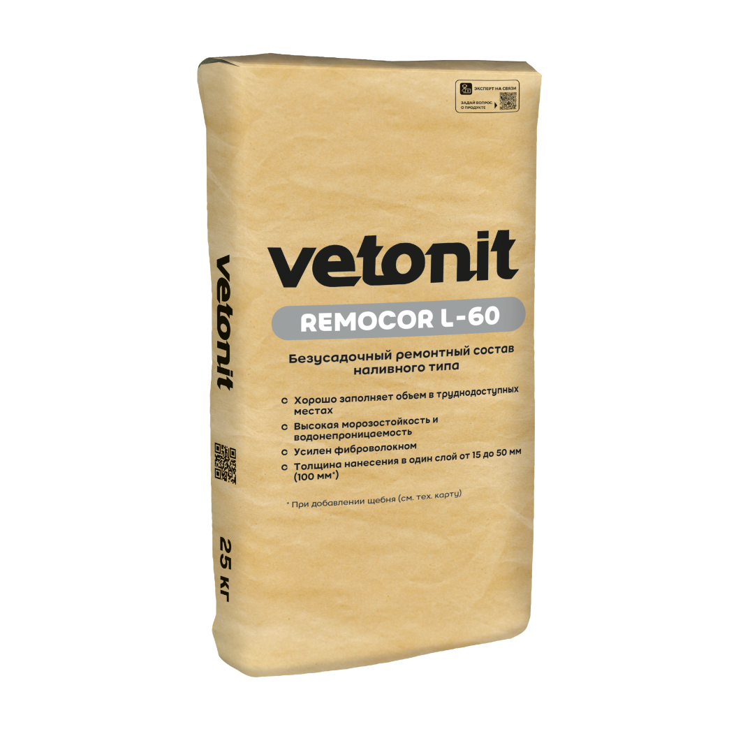 Безусадочный ремонтный состав наливного типа Ветонит (vetonit) remocor L-60 используется для выравнивания и ремонта бетонных конструкций, а также для заполнения углублений на горизонтальных поверхностях. Толщина укладки в один слой от 15 до 50 мм, для заливки толщины слоя от 50 до 100 мм необходимо добавлять щебень в соответствии с рекомендациями.