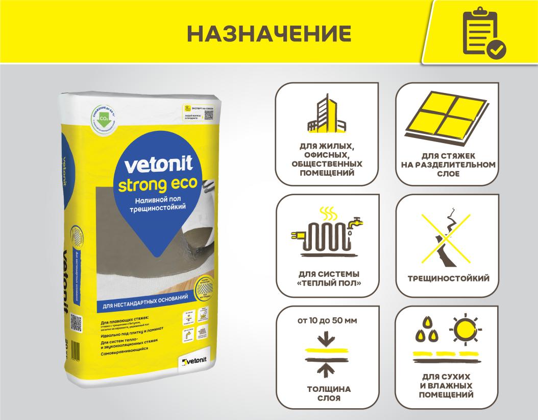 Ветонит (vetonit) Strong Eco - самовыравнивающийся наливной пол для нестандартных оснований под различные напольные покрытия и задачи. Прочный пол дополнительно усилен волокном, благодаря чему отлично подходит под тепло- и звукоизоляционные решения и для сложных оснований. Для ручного и механизированного нанесения. Ветонит (vetonit) strong eco был специально разработан для снижения углеродного индекса (C02) при производстве до 20% по сравнению с weber.Ветонит (vetonit) strong.