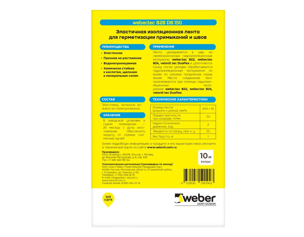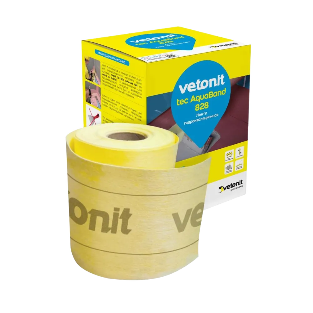 Ветонит (vetonit) Tec AquaBand 828 - эластичная гидроизоляционная лента для герметизации примыканий и швов, вертикальных и горизонтальных температурных деформационных швов в помещениях и снаружи зданий, вертикальных (внешних и внутренних) и горизонтальных примыканий типа стена/стена, стена/пол, а также мест соединений разнородных материалов (дерево, металл, бетон, блоки из ячеистого бетона, ГКЛ, пазогребневые гипсовые плиты и пр.). Для герметизации выхода труб, кабелей, в местах сливных колодцев и монтажных отверстий. Для защиты подвалов, террас, балконов, а также мест, находящихся в постоянном контакте.